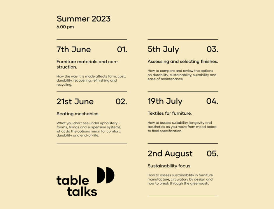 Aimed at those of you who are knowledge-hungry, MARK’s co-founder John Miller will be hosting a series of informal 45 minute Table Talks in a series that gets behind the scenes of furniture design, specification and manufacture – we’ll then make good use of the terrace and serve up some tasty G&T’s!