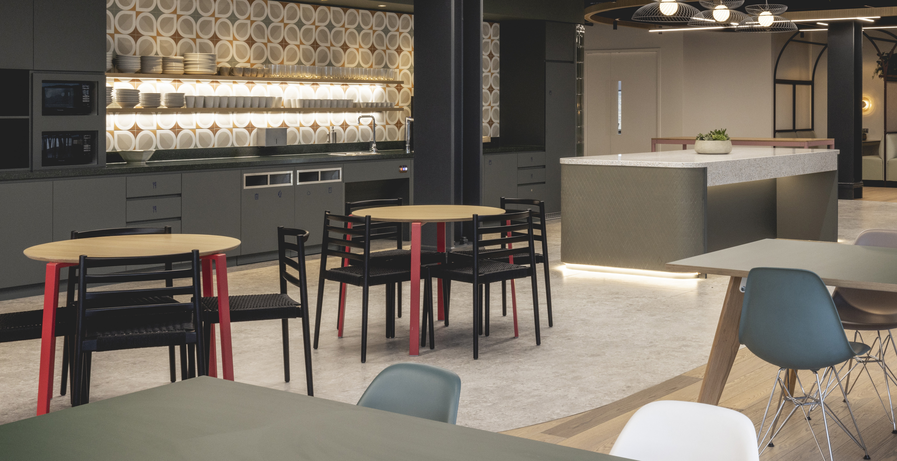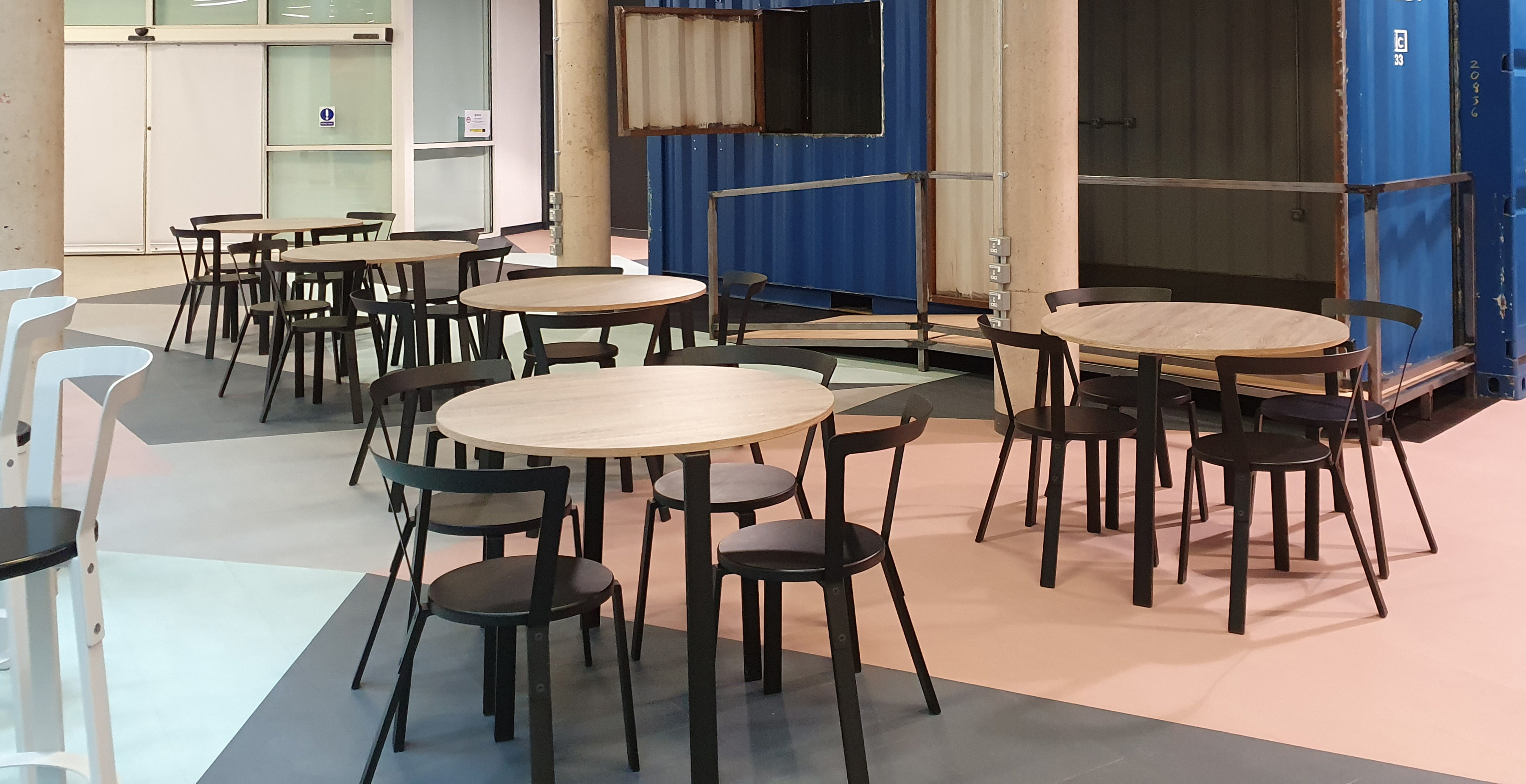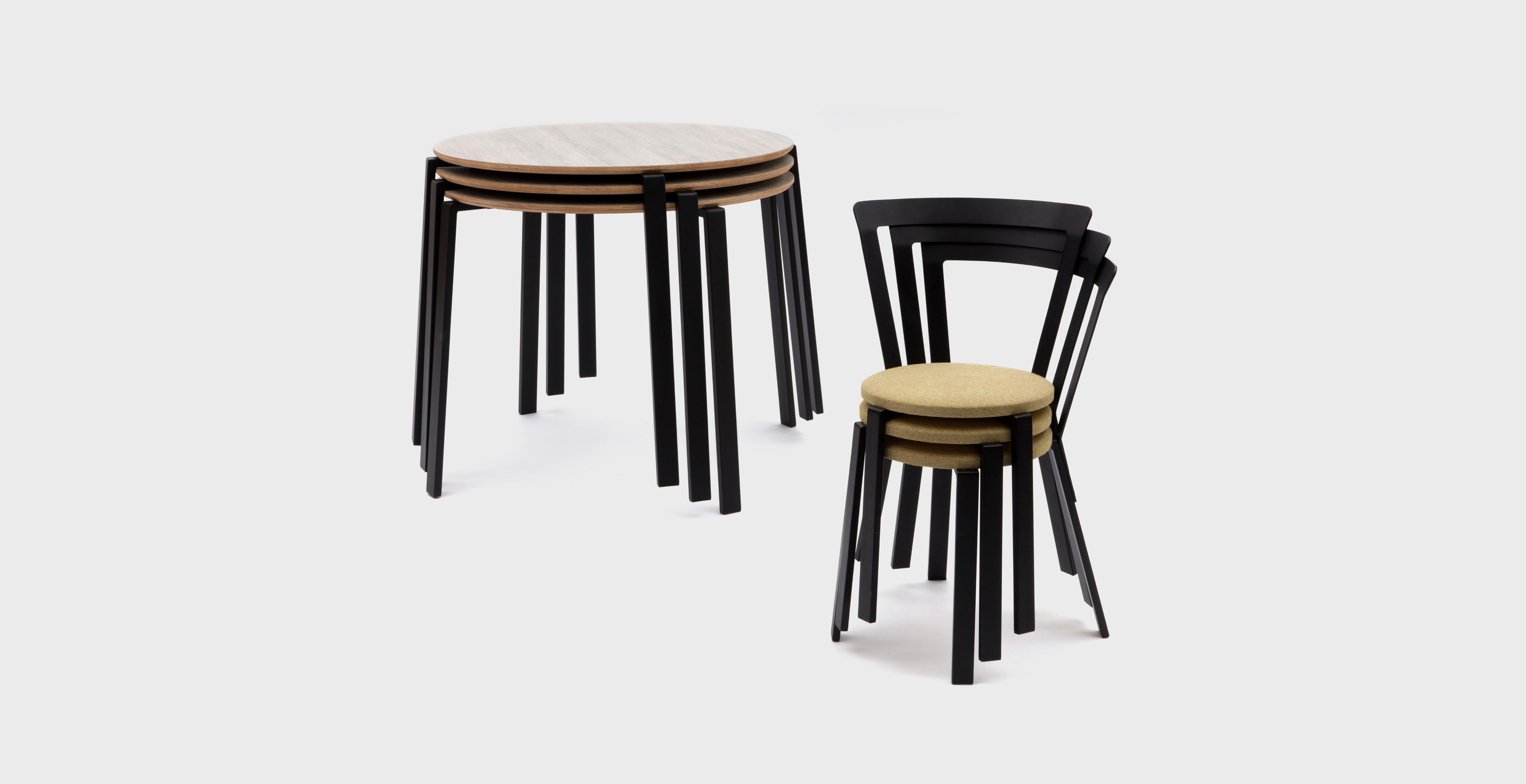 Square and round tables are part of the wider range including stacking chair and low stools, with bar and kitchen height stools (with or without backs); the round table being suitable for stacking.
