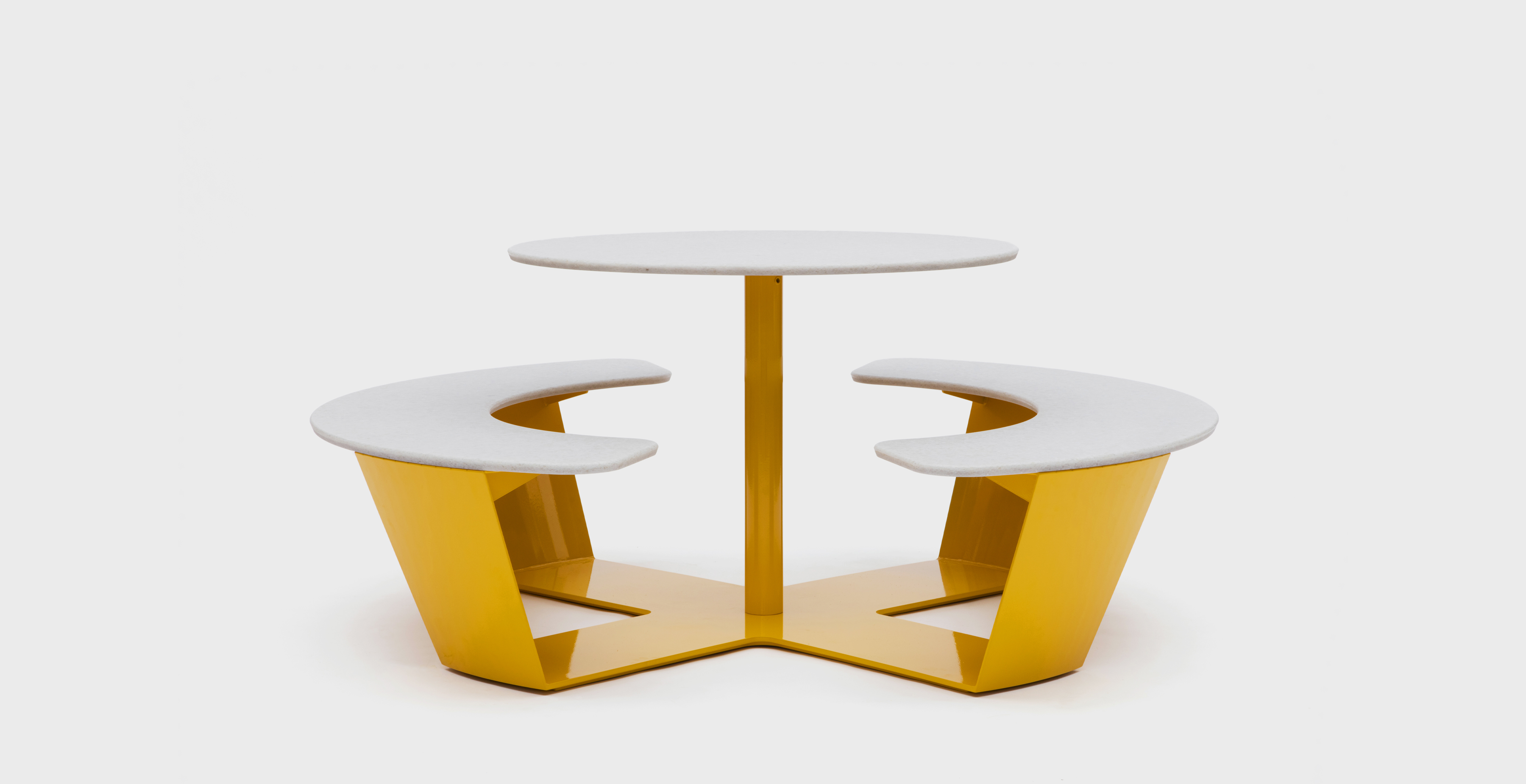 The footprint fully assembled is 1750mm with a 1000mm diameter table top. It is deliberately heavy so it can’t be blown away from rooftop terraces or lifted from public realm areas.