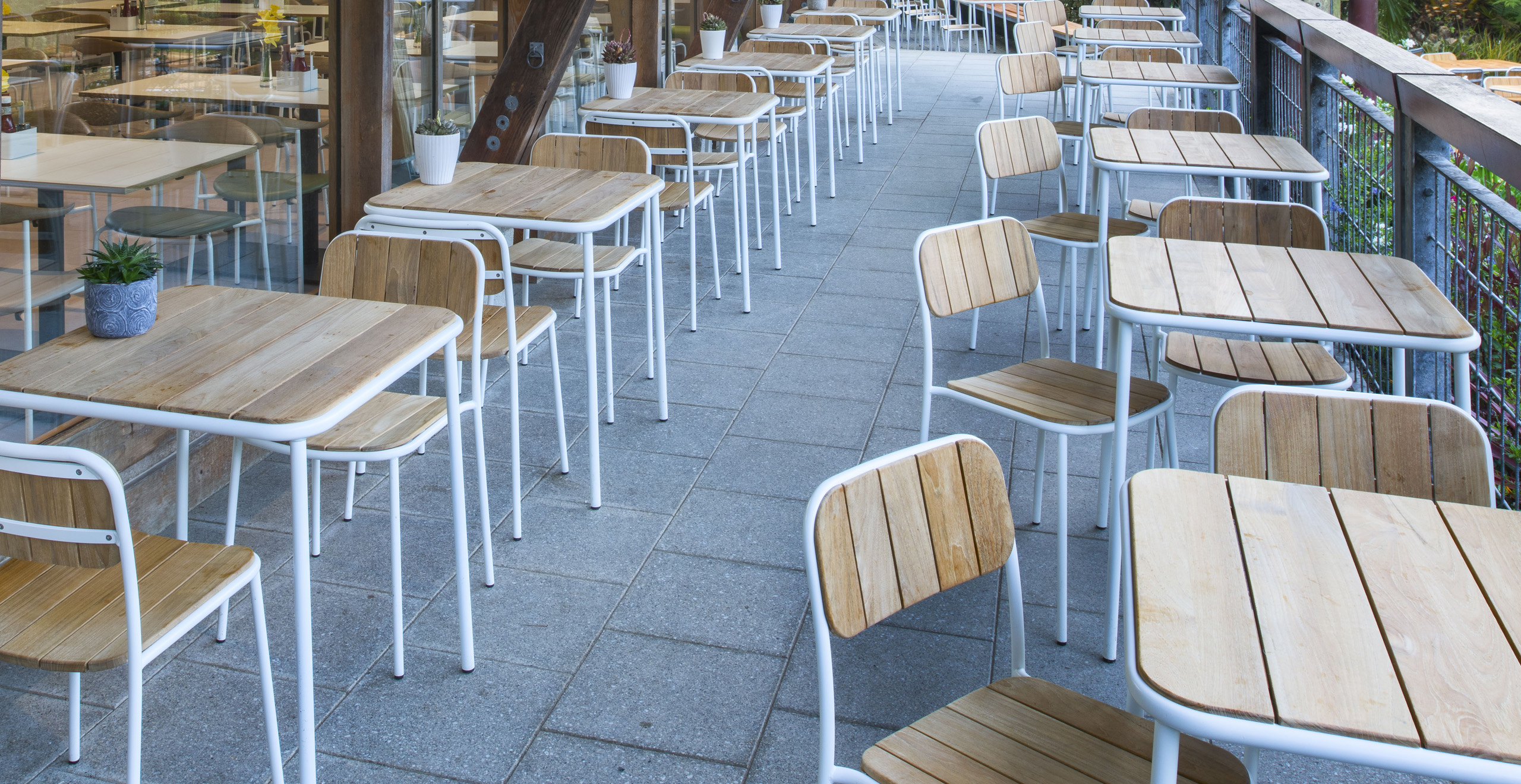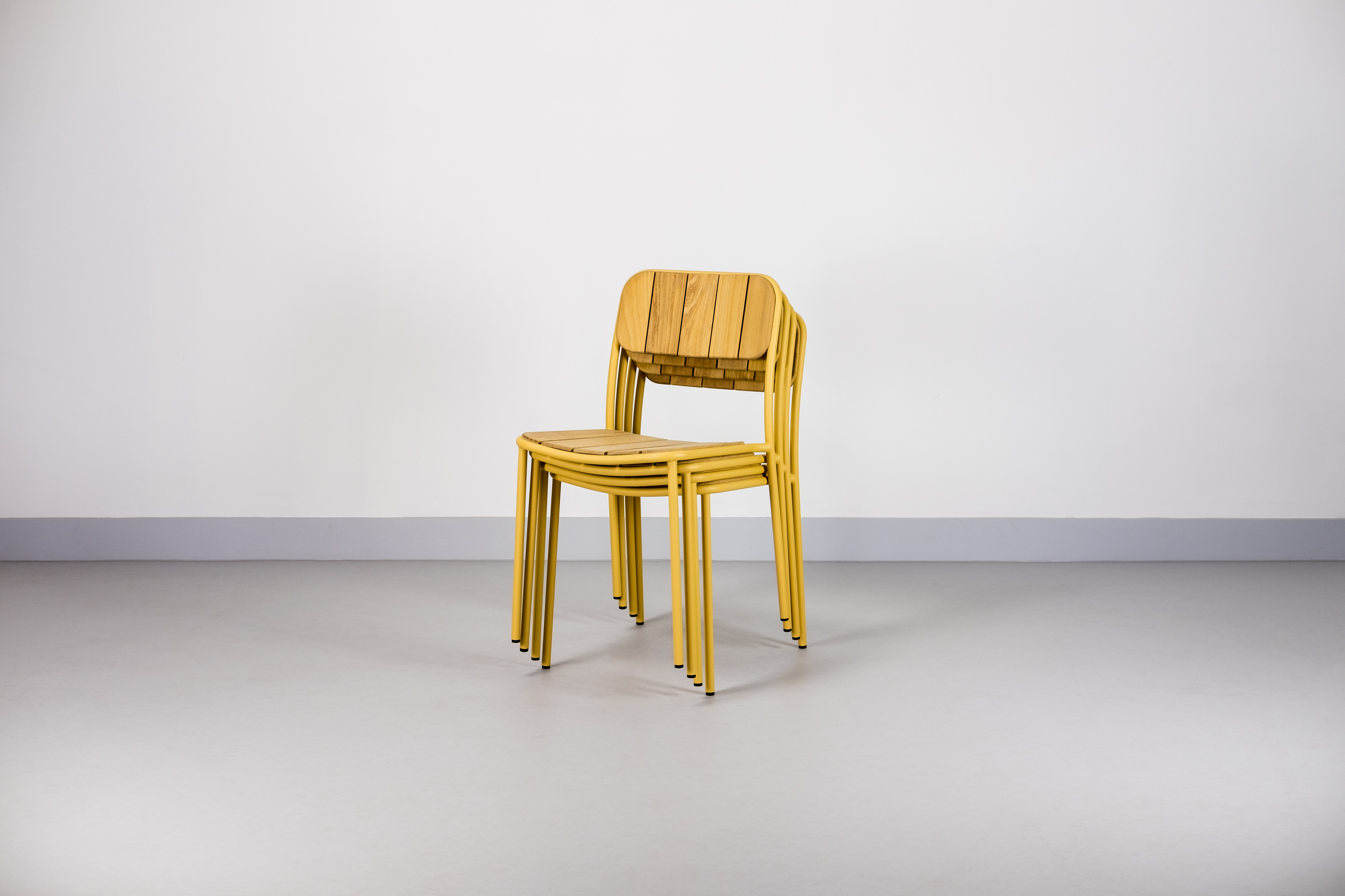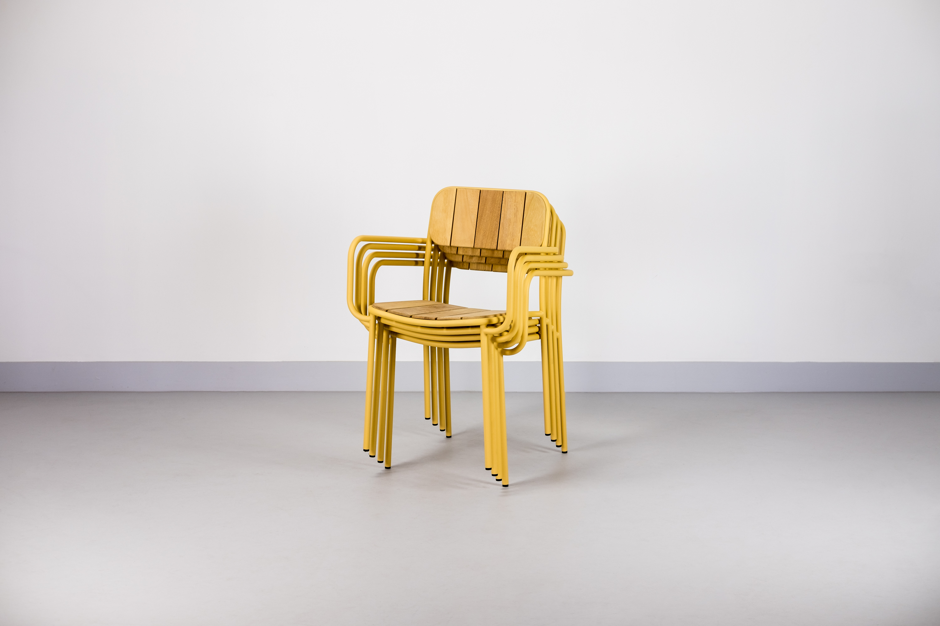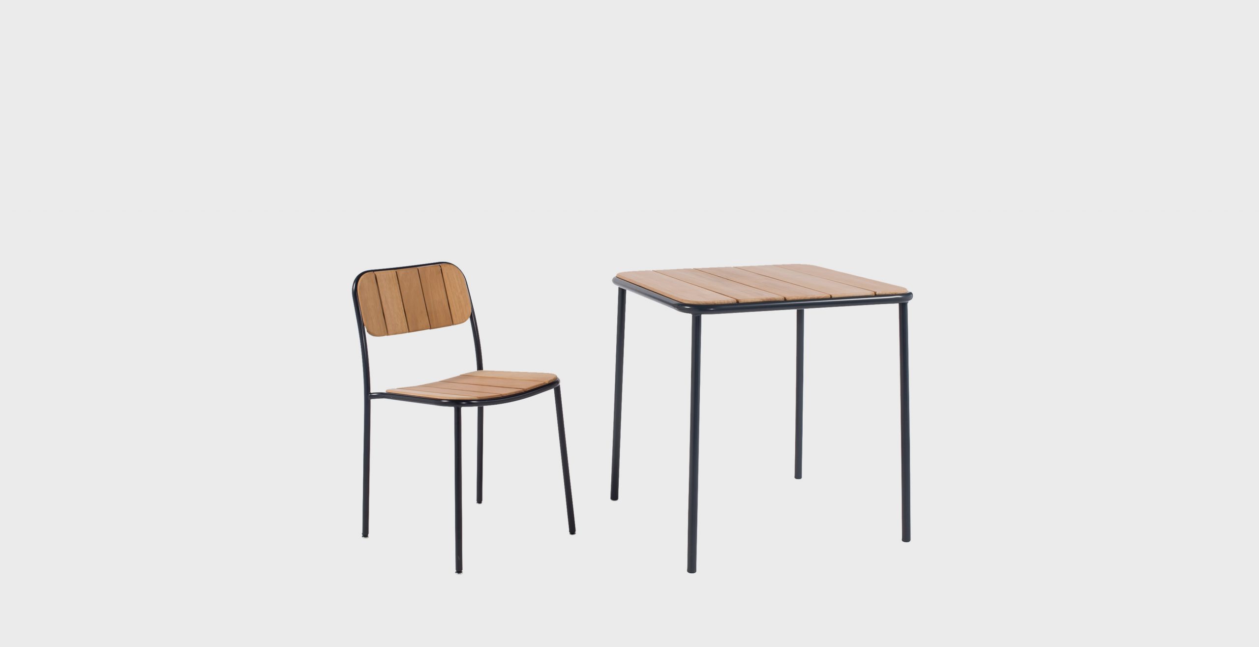 Its compact footprint saves space and reduces clutter, stacking 7 high when not in use and can be partnered with a a coordinating table; perfectly suited to an outdoor café and dining environments.