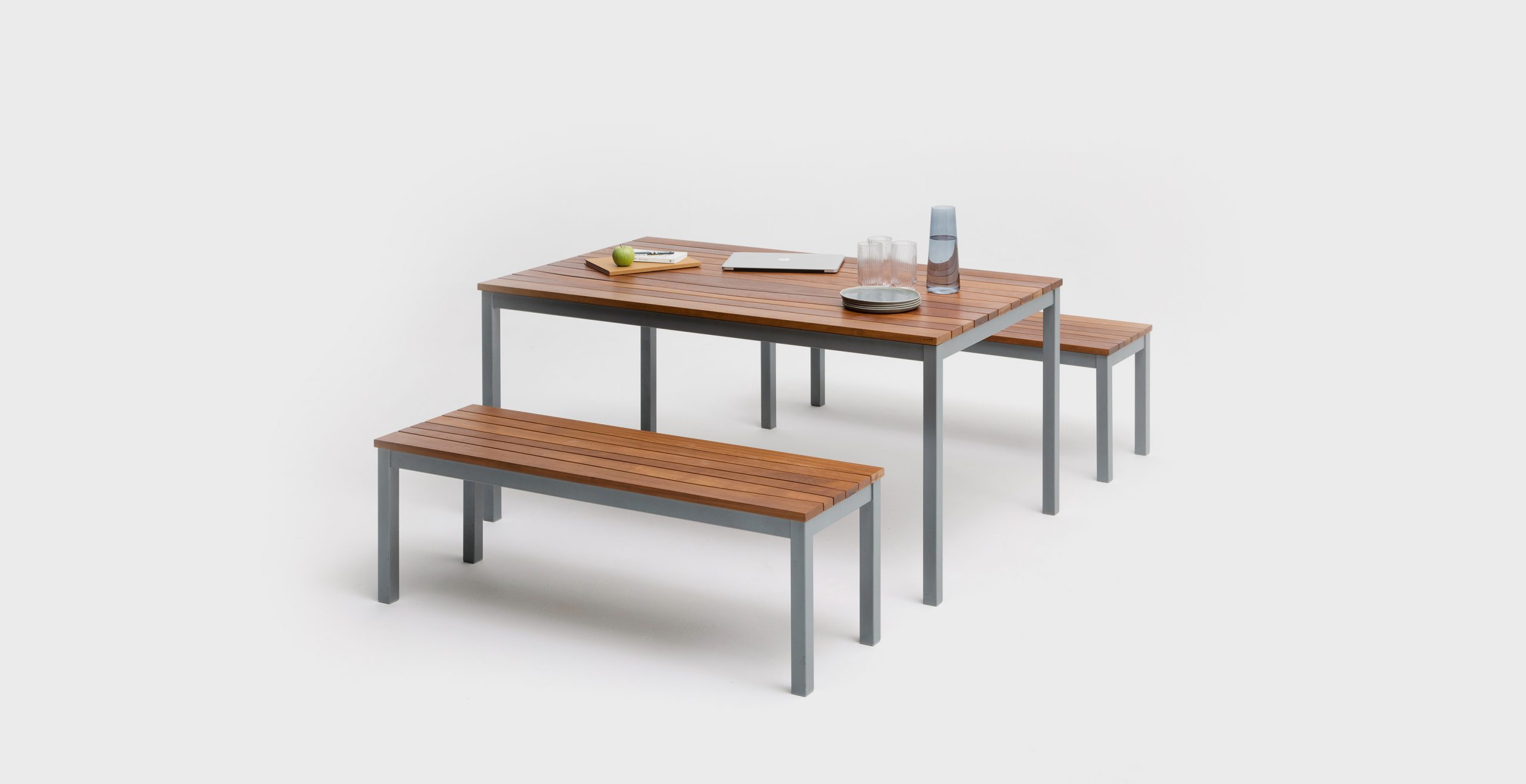The WAVE table with matching benches are used outside as well as inside. Even without treatment, the timber will last many years due to its natural oils. The high quality materials used are chosen to age well in the British weather.