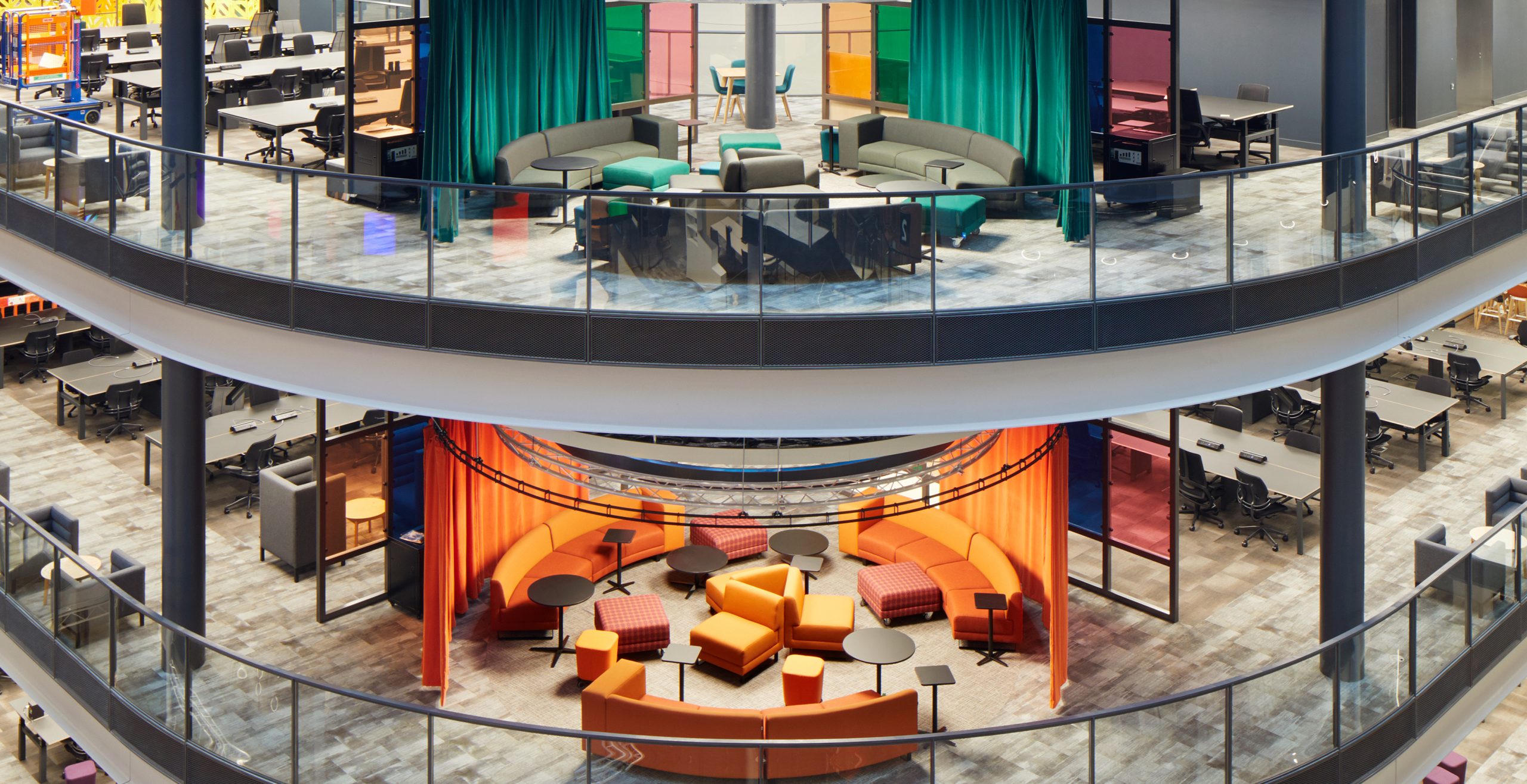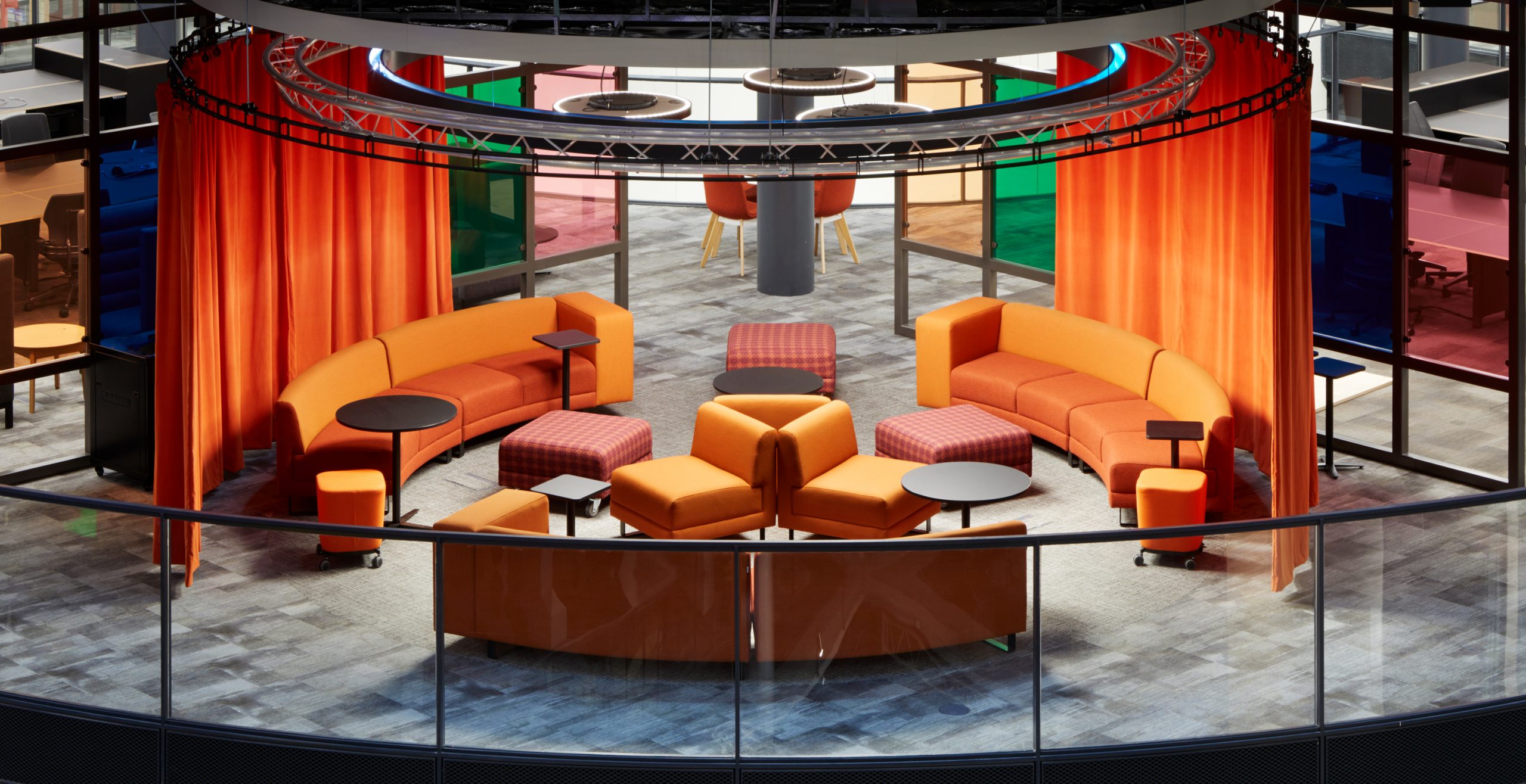 Studioscape sofas were customised to perfectly complement the circular collaboration spaces – a gently curved module was produced to echo the curved walls of these zones. We went through a rigorous sampling process with the BBC’s designers ID:SR Sheppard Robson, to trial and test different heights and sizes of tables, and seating elements on both wheels and sleds. These zones have become some of the defining spaces of the project.