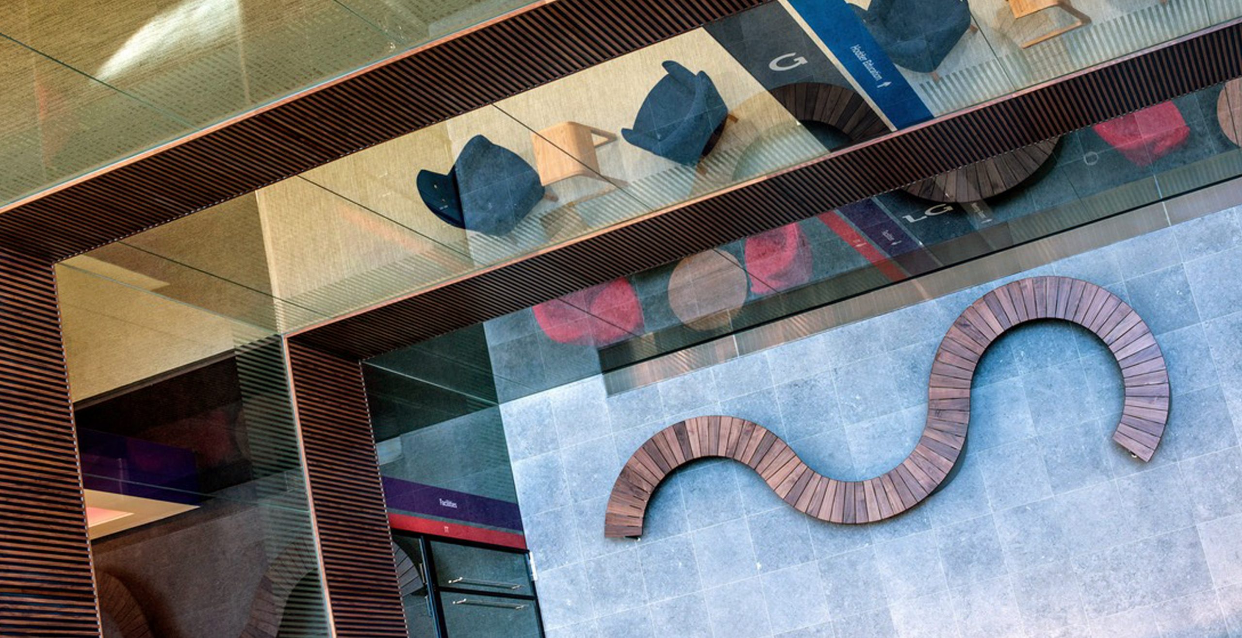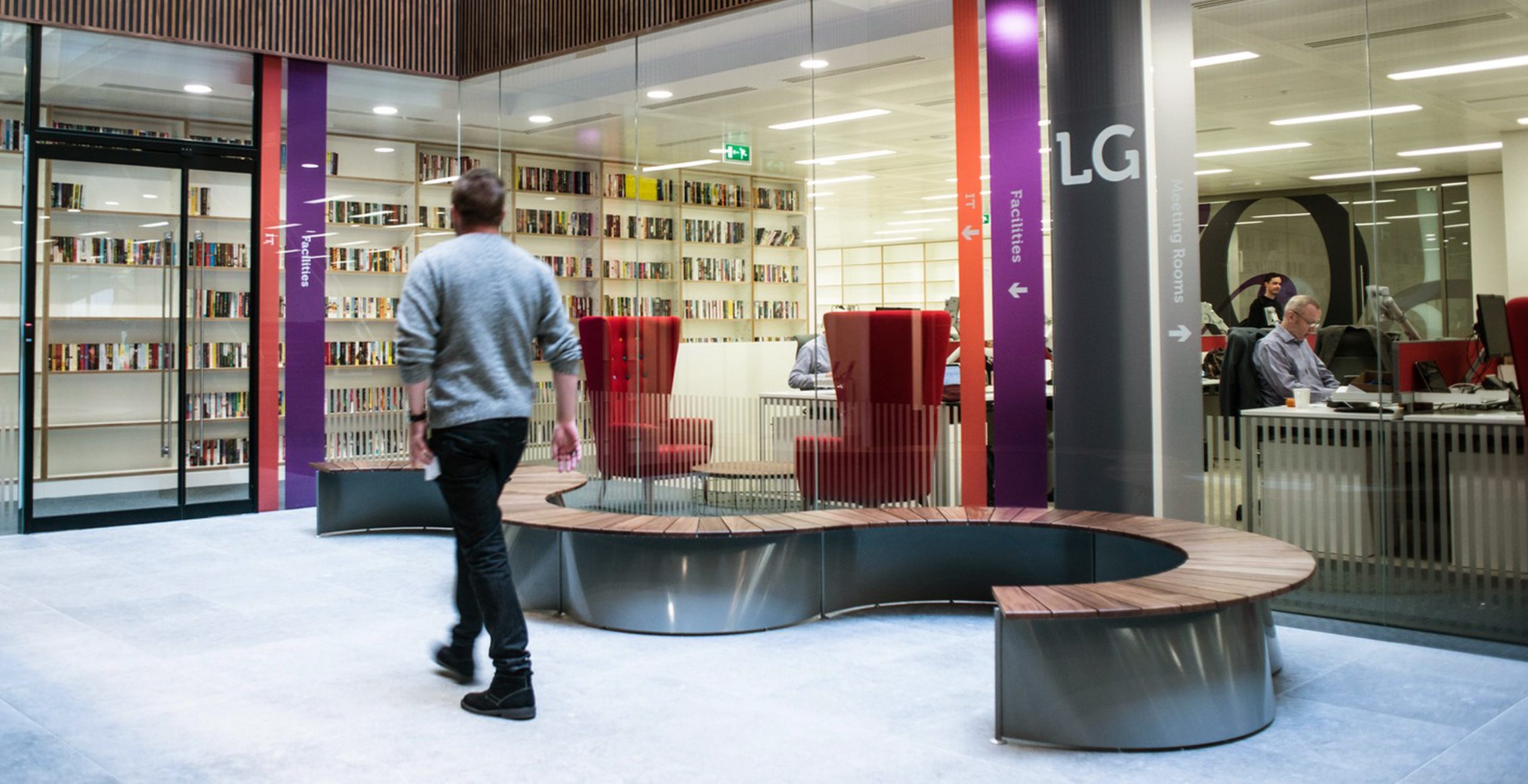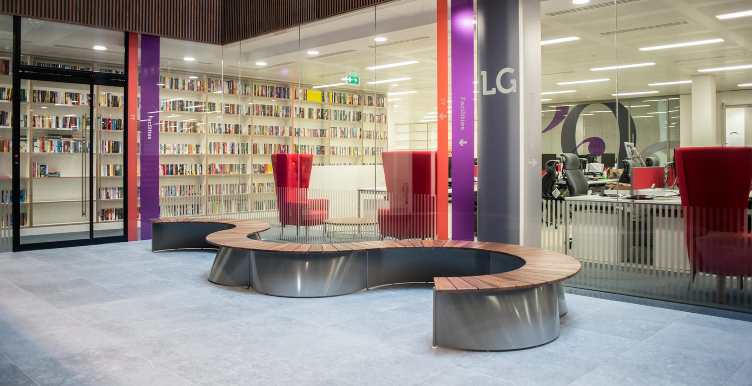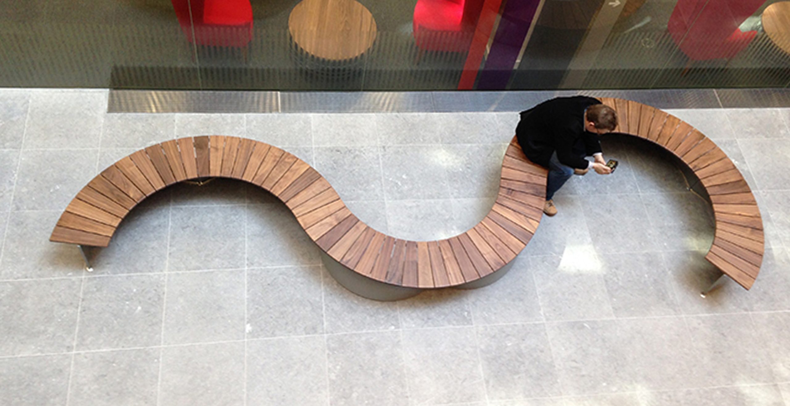 The MARK Product Arc bench sits perfectly within this indoor/outdoor office environment.